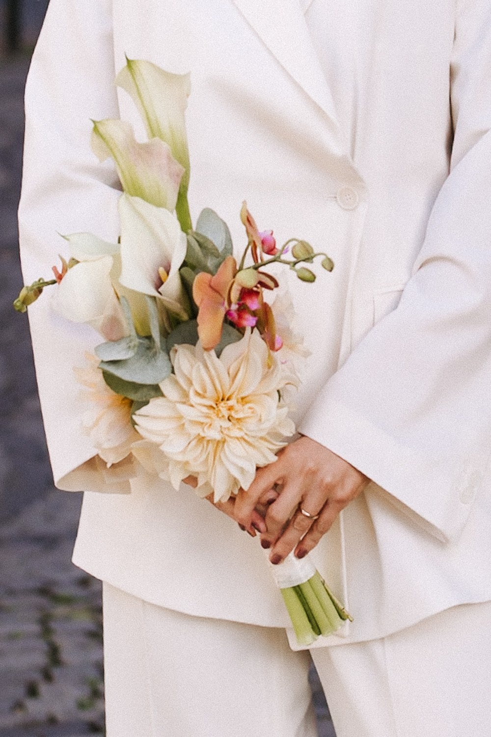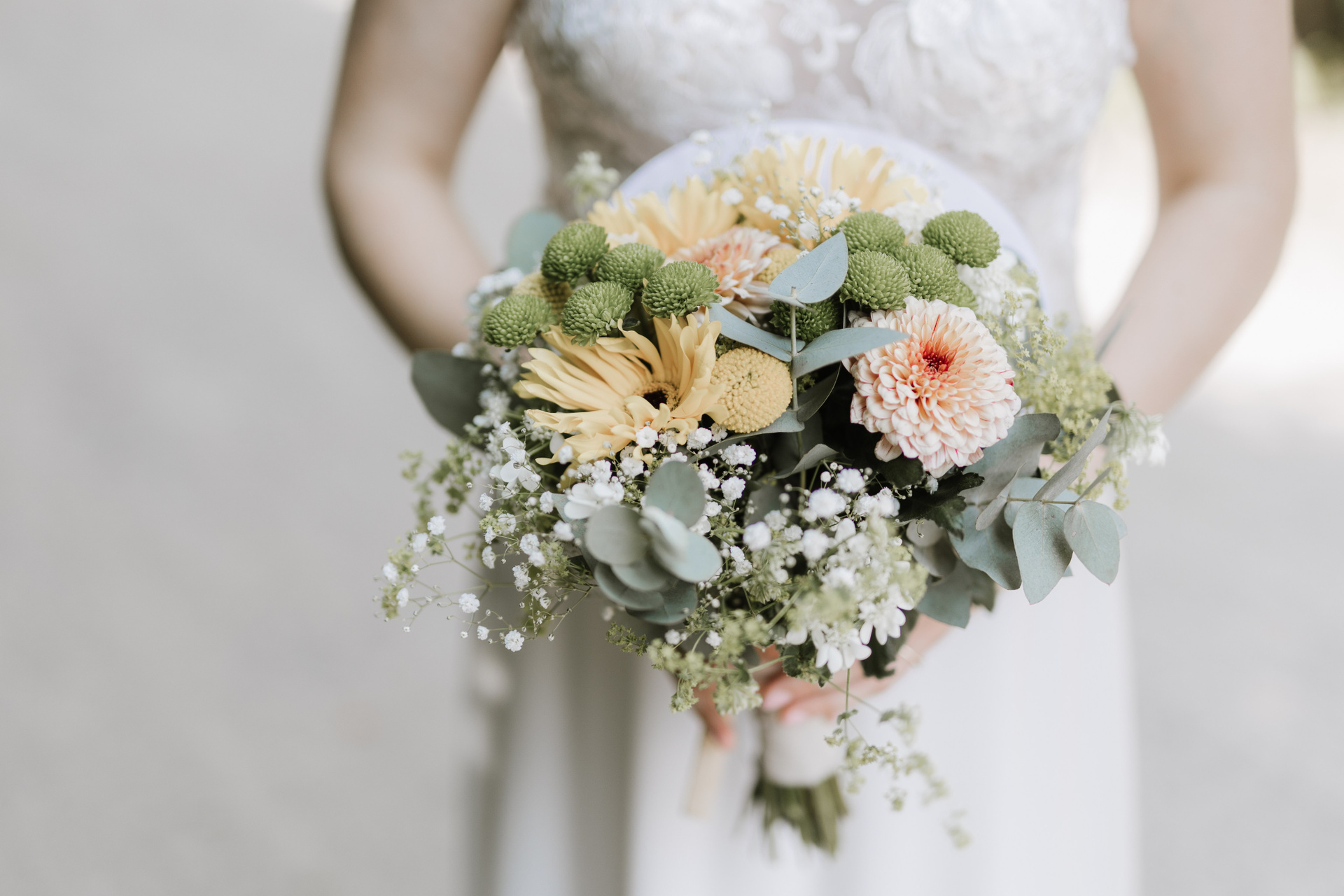 Sanfte Pastelltöne, üppige Formen, viel Grün und kleine Blumen – Pfingstrosen, Ranunkeln, Fresien. Dieser Strauß wirkt wie aus einem Märchen und passt zu emotionalen, atmosphärischen Hochzeiten.