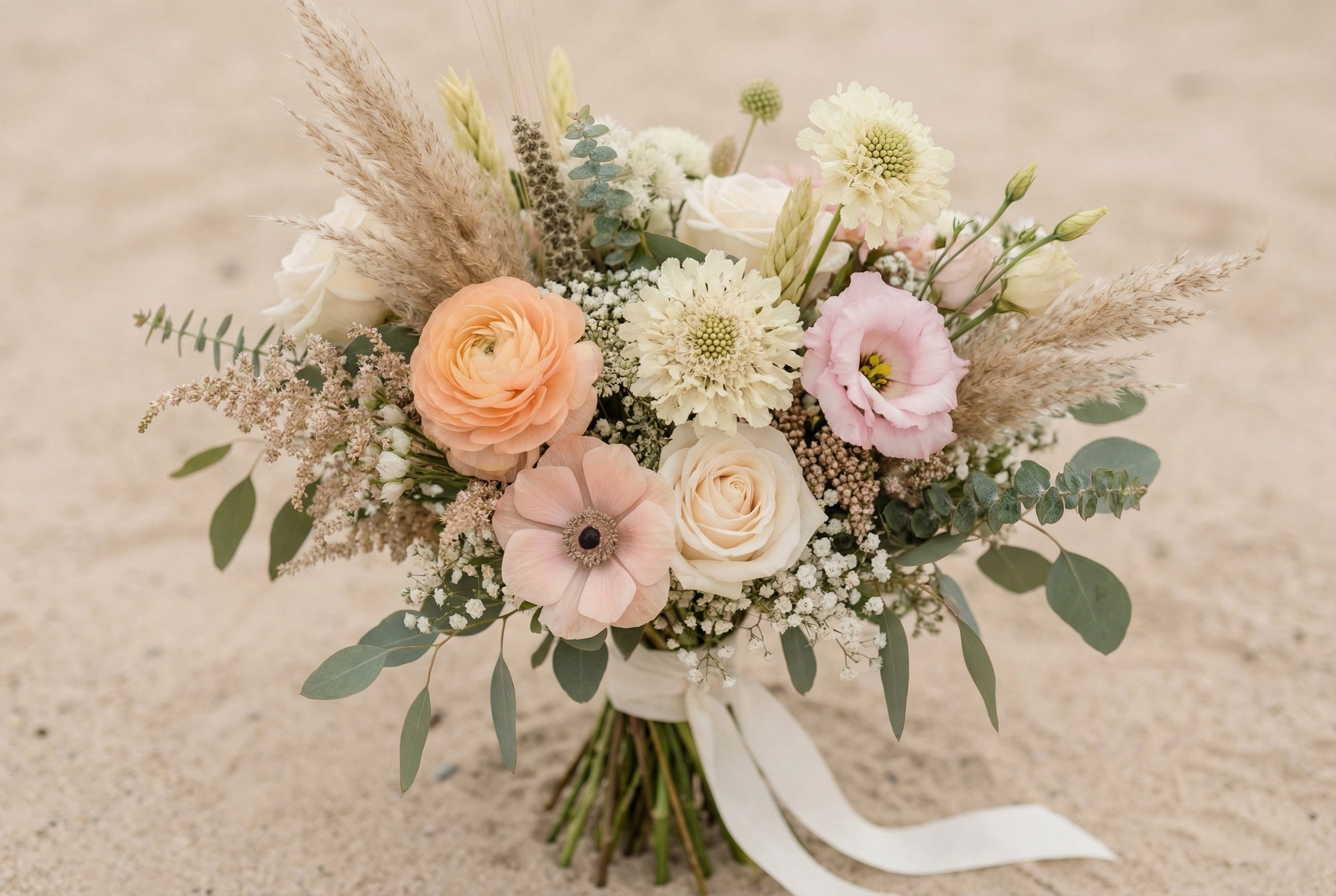 Unregelmäßige Formen, wilde Blumen, Gräser und Zweige für Leichtigkeit und Natürlichkeit. Ideal für Hochzeiten in der Natur, im Garten oder am Strand.